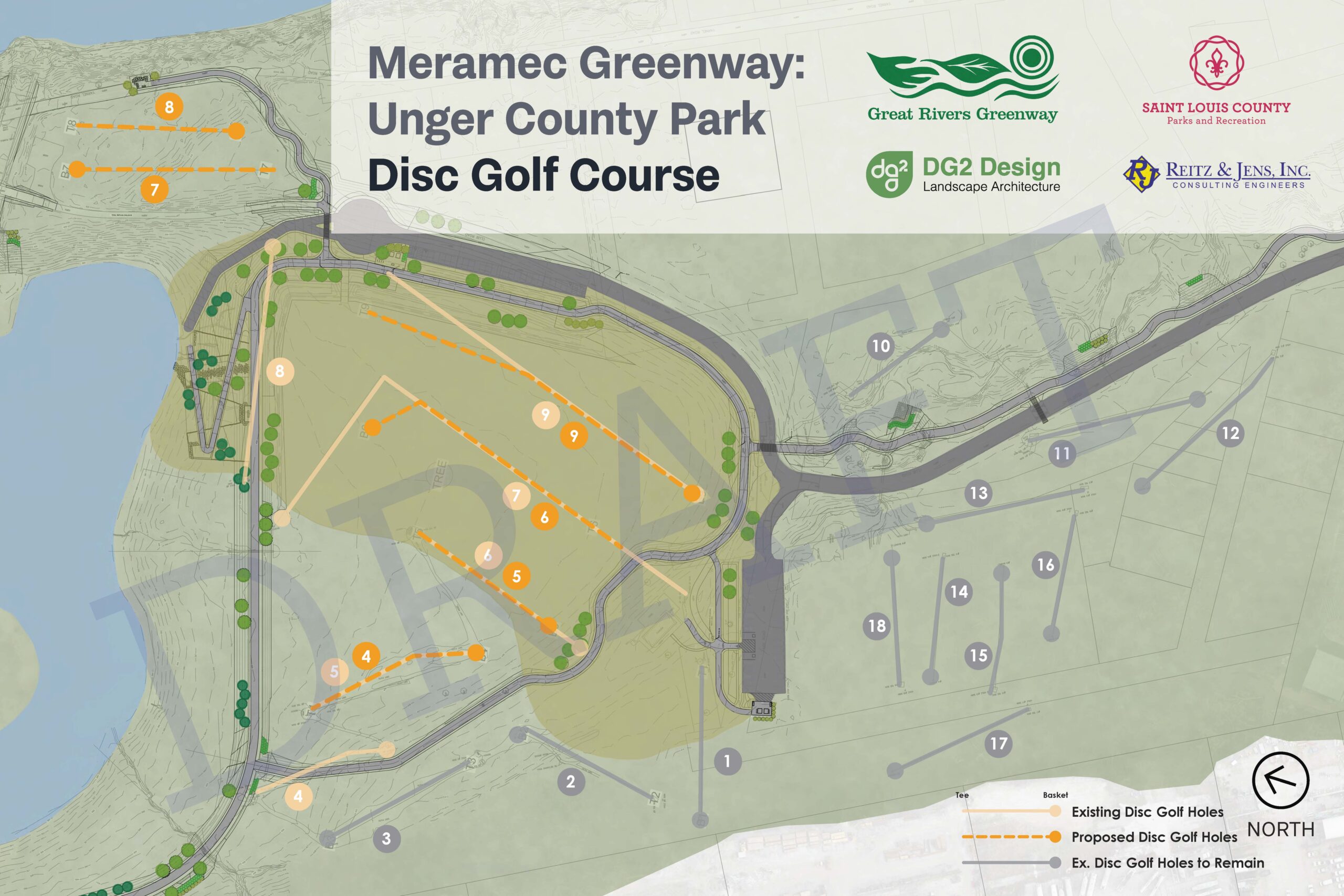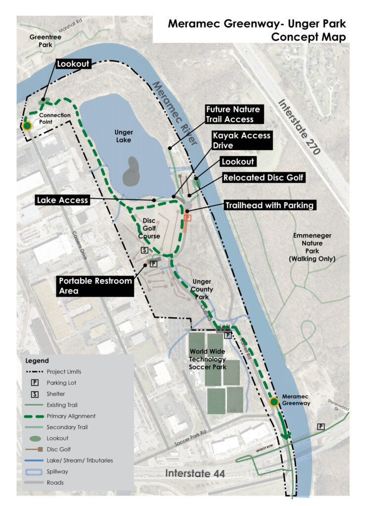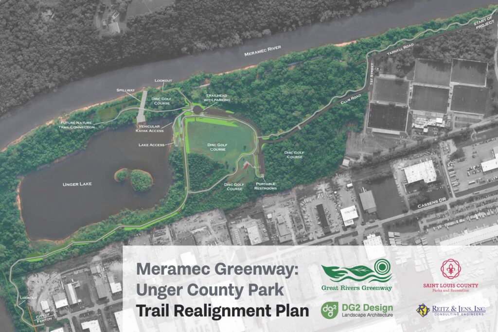 Unger County Park in St. Louis County near Fenton, Missouri. The map to the right shows the recommended trail alignment and proposed amenity improvements to Unger Park based on feasibility studies and community input.