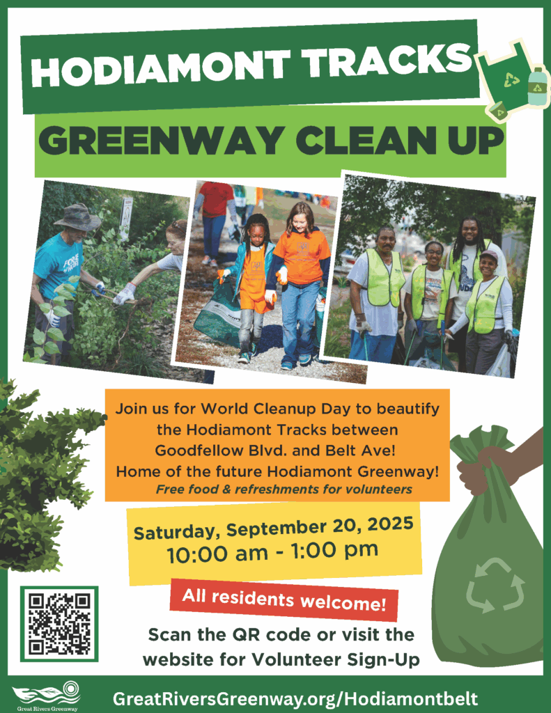 The section of the Hodiamont Greenway between Goodfellow Blvd. and Belt Ave. is moving forward and we are kicking things off with a clean-up on World Clean Up Day!